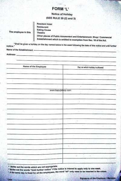 अवकाश नियम 20 (2) और 3 का फॉर्म एल नोटिस – दुकानें और प्रतिष्ठान अधिनियम के तहत 10 रूपों का सेट
