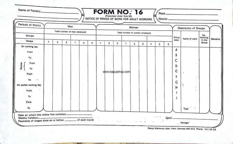 कारखानों अधिनियम के तहत वयस्क श्रमिकों के लिए कार्य प्रपत्र 16 की अवधि की सूचना